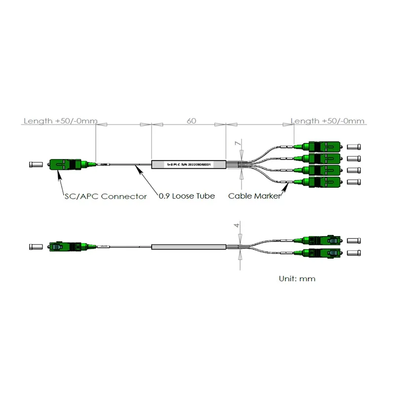 1 × 8 PLC Splitter Steel Tube Package 60x7x4mm, avec 900 μm de tube lâche 1,0 et 0,75 + 0,05 / -0 m, connecteur SC / APC.