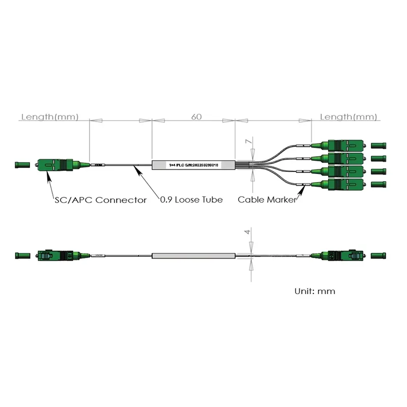 Ensemble de tubes en acier de séparateur 1x4 / 1 × 8 PLC 60x7x4 mm, avec tube lâche de 900 μm 1,0 + 0,1 / -0m, connecteur SC / APC.Spécifications de performance:ParamètresSymboleCaractéristiquesUnitéNuméro de canalCh1 × 41 × 8Longueur d'onde de f......